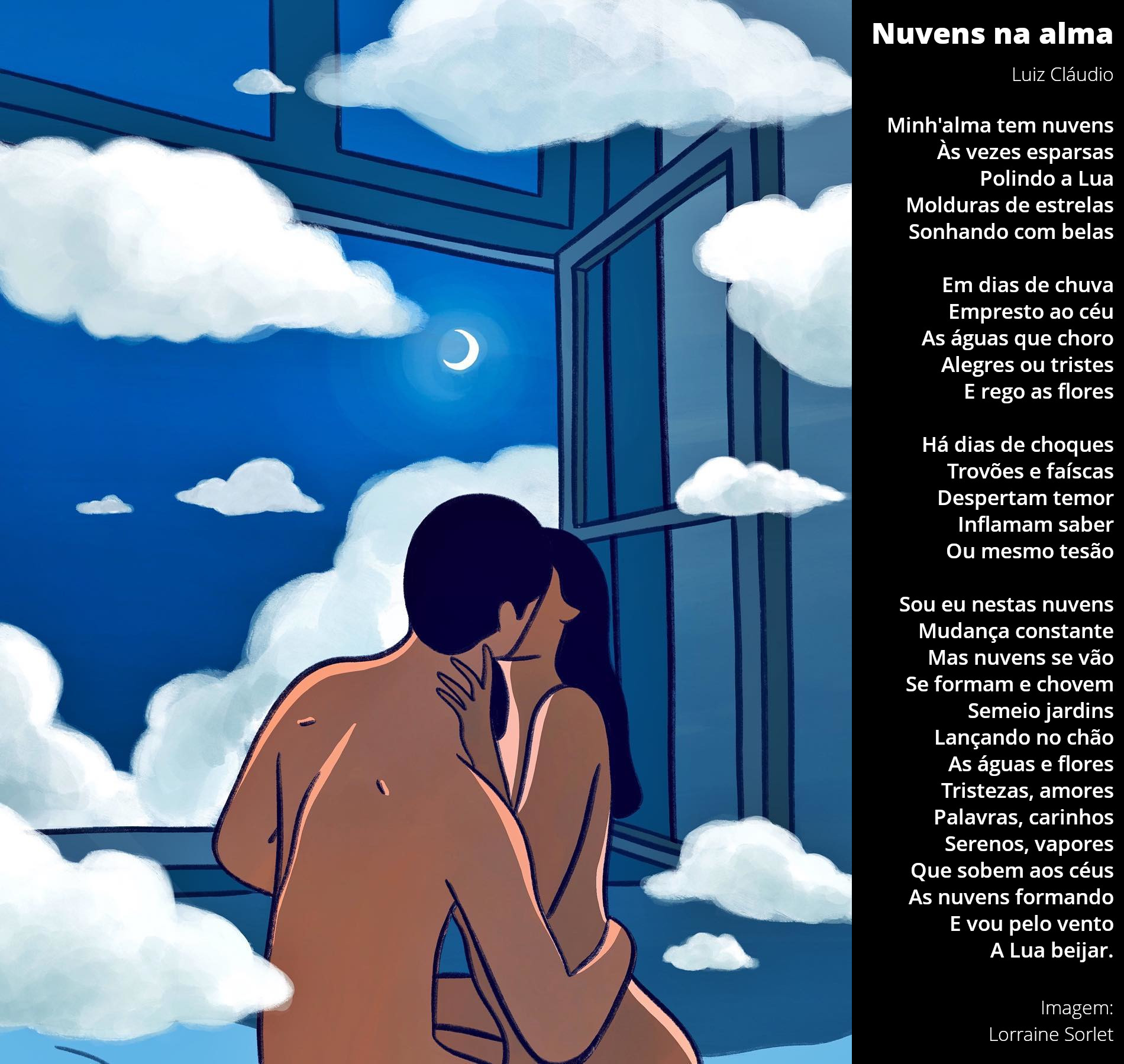 Minh'alma tem nuvensÀs vezes esparsasPolindo a LuaMolduras de estrelasSonhando com belasEm dias de chuvaEmpresto ao céuAs águas que choroAlegres ou tristesE rego as floresHá dias de choquesTrovões e faíscasDespertam temorInflamam saberOu mesmo tesãoSou eu nestas nuvensMudança constanteMas nuvens se vãoSe formam e chovemSemeio jardinsLançando no chãoAs águas e floresTristezas, amoresPalavras, carinhosSerenos, vaporesQue sobem aos céusAs nuvens formandoE vou pelo ventoA Lua beijar.