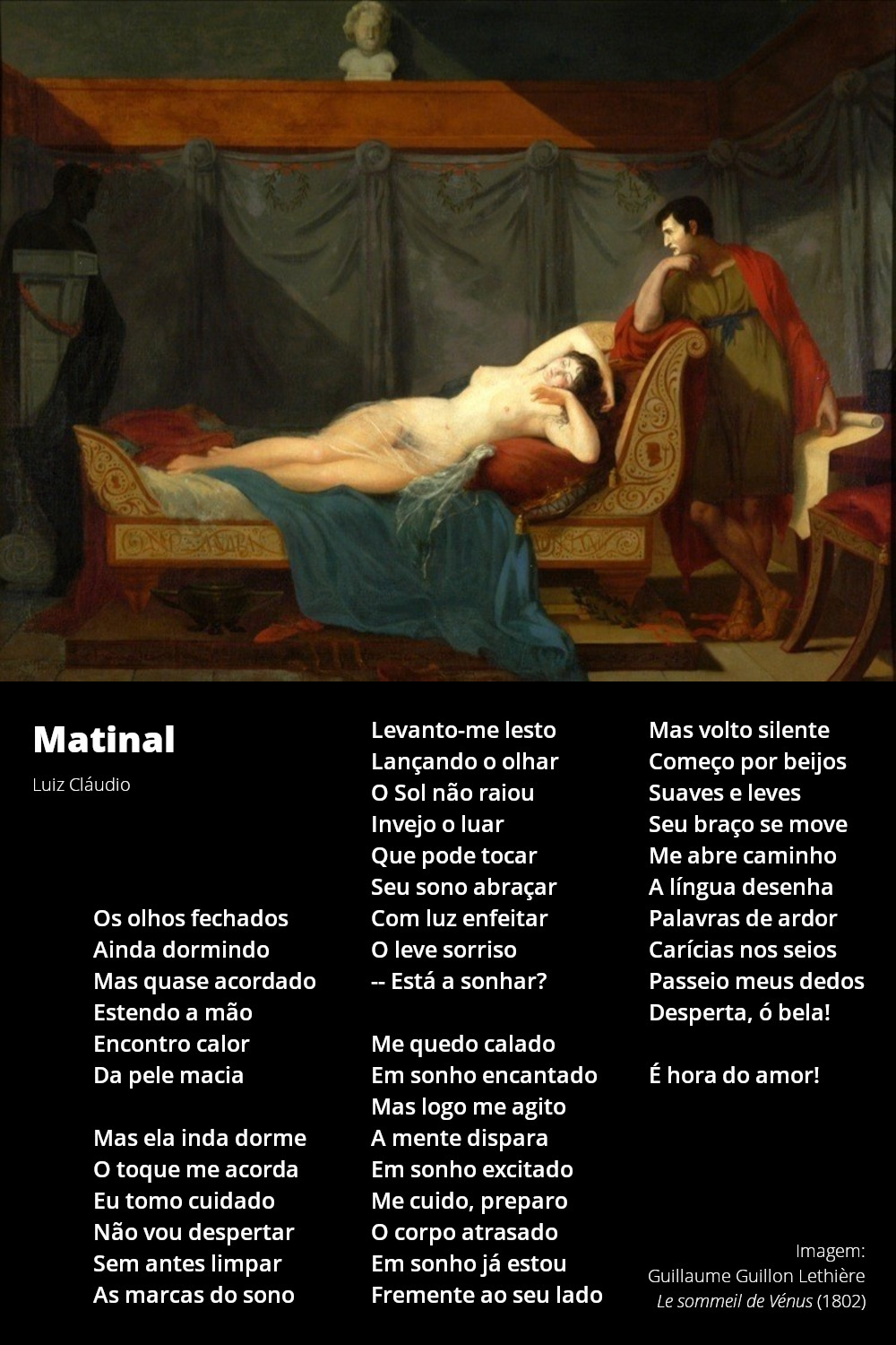 Os olhos fechadosAinda dormindoMas quase acordadoEstendo a mãoEncontro calorDa pele maciaMas ela inda dormeO toque me acordaEu tomo cuidadoNão vou despertarSem antes limparAs marcas do sonoLevanto-me lestoLançando o olharO Sol não raiouInvejo o luarQue pode tocarSeu sono abraçarCom luz enfeitarO leve sorriso-- Está a sonhar?Me quedo caladoEm sonho encantadoMas logo me agitoA mente disparaEm sonho excitadoMe cuido, preparoO corpo atrasadoEm sonho já estouFremente ao seu ladoMas volto silenteComeço por beijosSuaves e levesSeu braço se moveMe abre caminhoA língua desenhaPalavras de ardorCarícias nos seiosPasseio meus dedosDesperta, ó bela!É hora do amor!
