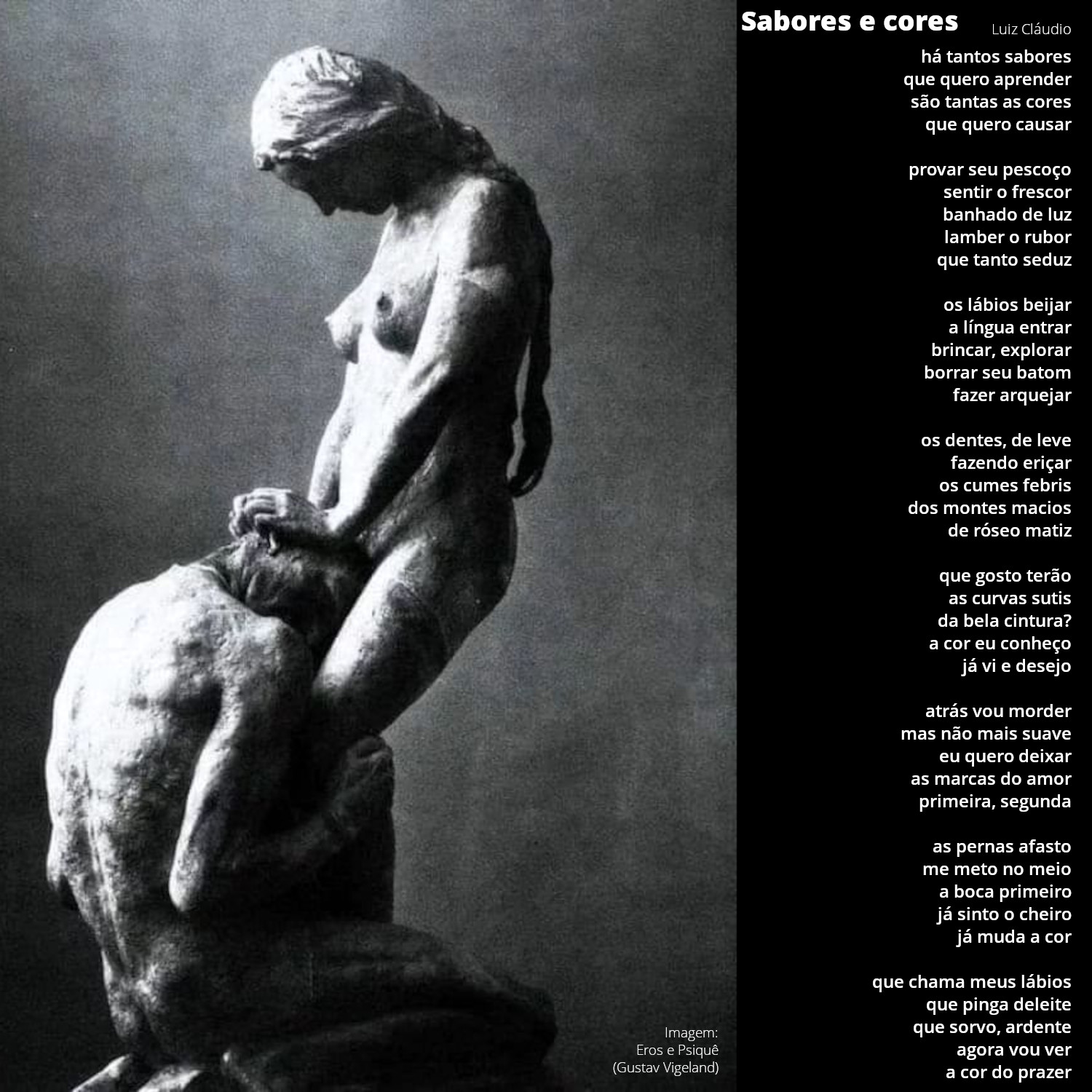 há tantos saboresque quero aprendersão tantas as coresque quero causarprovar seu pescoçosentir o frescorbanhado de luzlamber o ruborque tanto seduzos lábios beijara língua entrarbrincar, explorarborrar seu batomfazer arquejaros dentes, de levefazendo eriçaros cumes febrisdos montes maciosde róseo matizque gosto terãoas curvas sutisda bela cintura?a cor eu conheçojá vi e desejoatrás vou mordermas não mais suaveeu quero deixaras marcas do amorprimeira, segundaas pernas afastome meto no meioa boca primeirojá sinto o cheirojá muda a corque chama meus lábiosque pinga deleiteque sorvo, ardenteagora vou vera cor do prazer